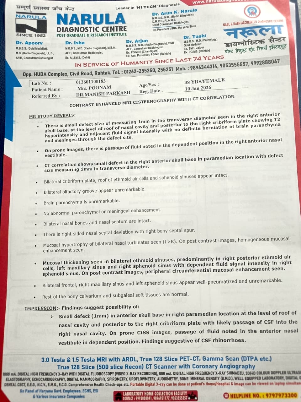 As the Csf leak was not severe a test report dated revealed to breach at the base of skull. Meanwhile she came across few of our real-time cured cases of Csf rhinorrhea and booked an online consultation on 25th Dec 2025.