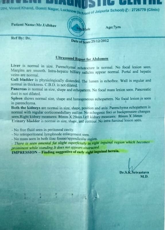 Dr Ravi advised to undergo ultrosonography in doubt of inguinal hernia. Diagnosis of Dr Ravi was right and ultrasonography dated 25/12 /2012 revealed Inguinal hernia, it stated like There is seen omental fat slight superficially in right inguinal region which becomes prominent while standing It does not appears obstructed