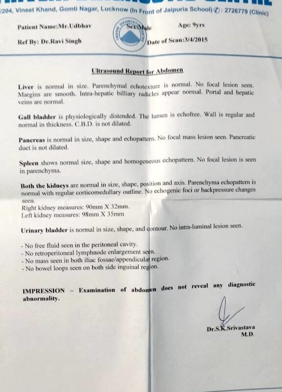We have started treatment with Medicine transmission of Lycopodium 0/1 and child got cured. We have stopped treatment. We insisted to re scan, but parents were avoiding, after many reminders finally in 2025 they tool the child to same ultrasound centre of Lucknow.