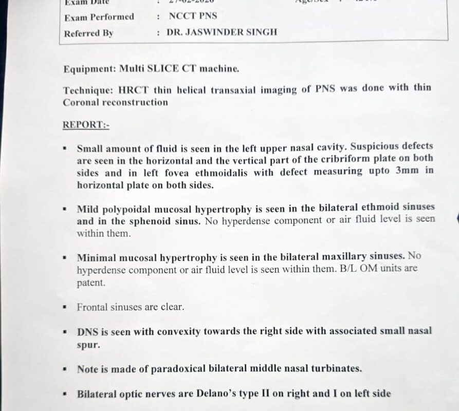 A patient from Patiala, Punjab, contacted Dr Ravi for her trouble with CSF leak from the brain. It was diagnosed correctly after NCCT PNS and fluid examination for Glucose.