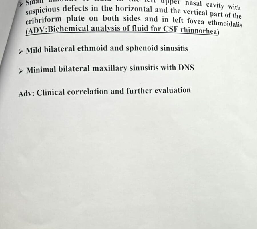 Imaging revealed a small amount of fluid in the left upper nasal cavity and defects in the cribriform plate and left fovea ethmoidalis, with a defect up to 3 mm in the horizontal plate. During a video consultation, active fluid leakage was observed, confirming the diagnosis. The patient had previously been advised to undergo surgery by her ENT surgeon, along with some conservative management. Concerned about surgery, she sought alternative treatments and found several evidence-based cases managed by our team. She scheduled an online consultation to discuss her options and was informed about the Medicine Energy Transmission procedure. After a week of consideration, she agreed to proceed. Following a detailed case history by Dr Shubham Soni, Natrum Mur 0/1 was selected and transmitted using her hair sample on 7 March 2026.